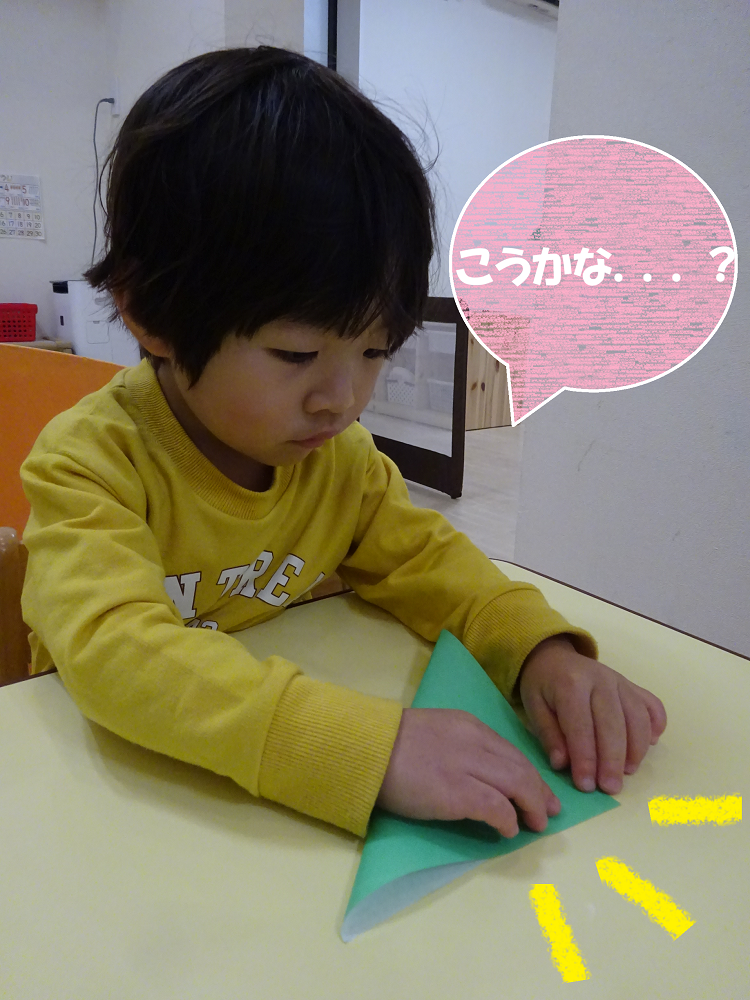 折る・貼る・切る・通す、という複数の工程に真剣に取り組む姿は、集中力や手先の発達もよく伝わる場面です。
