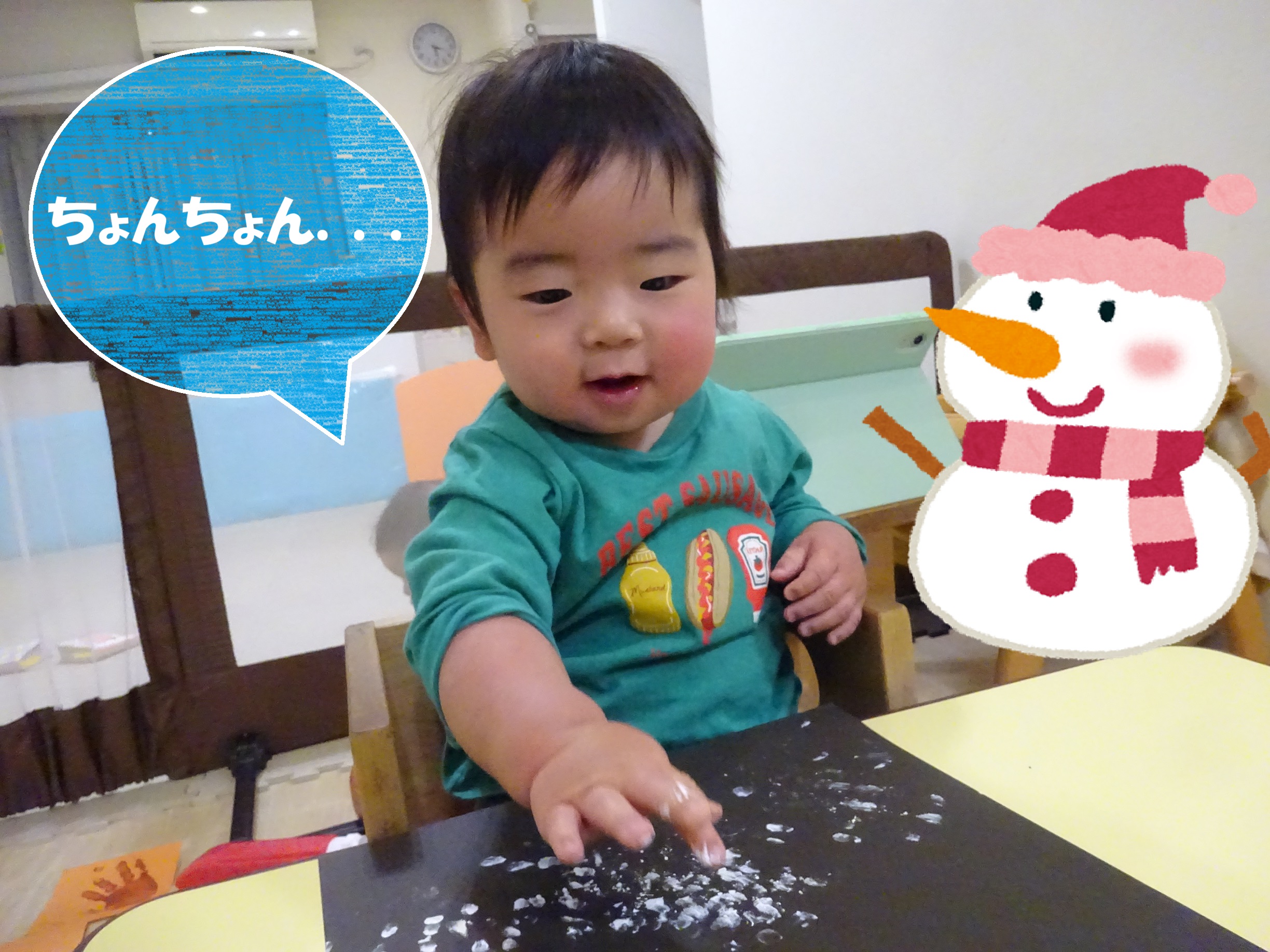 0歳児さんは、指で絵の具に触れて雪を表現したり、クリスマスツリーの台紙にシールを貼ったりしました⛄