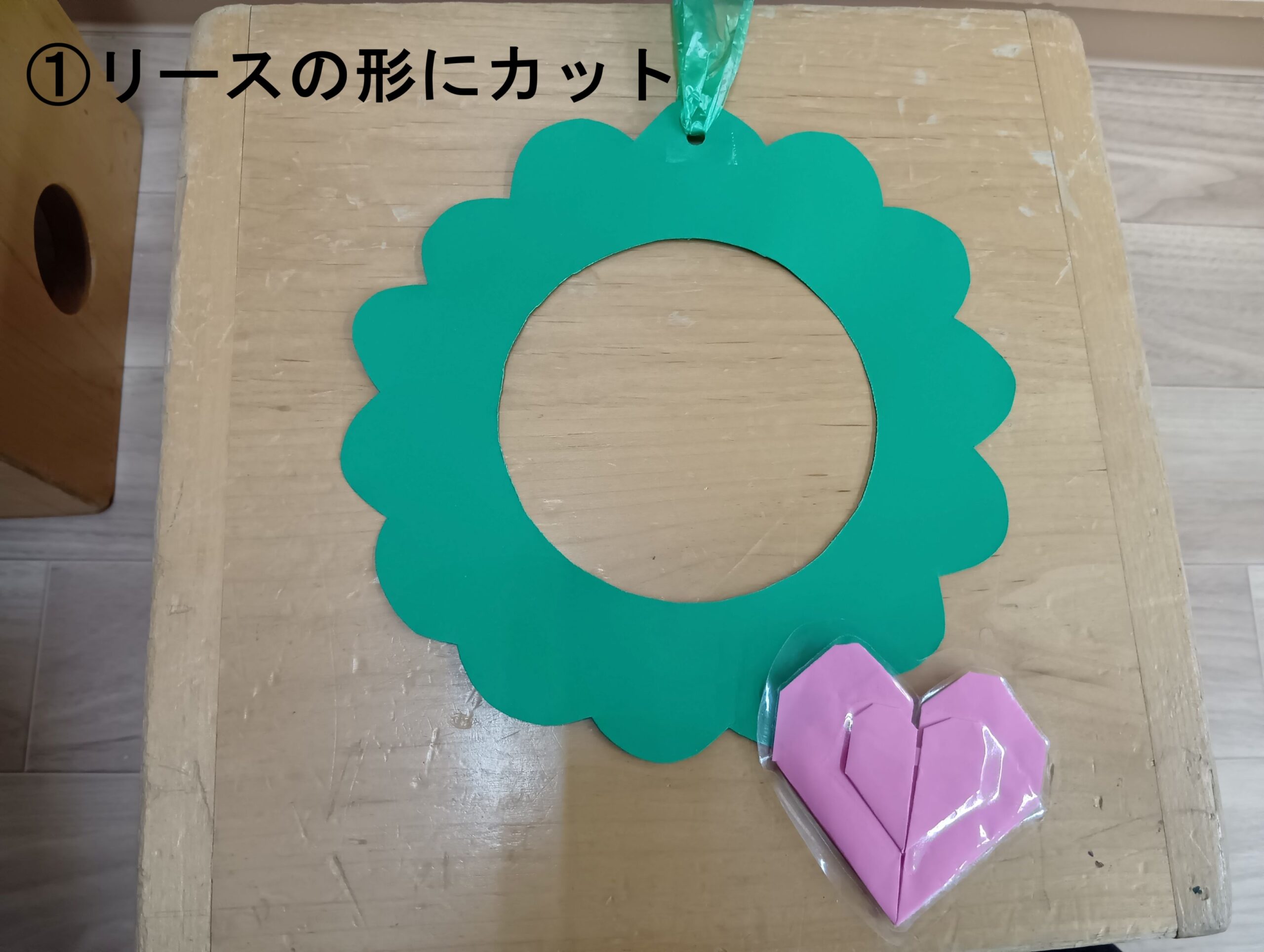 ➀緑色の画用紙をリースの形に切ります