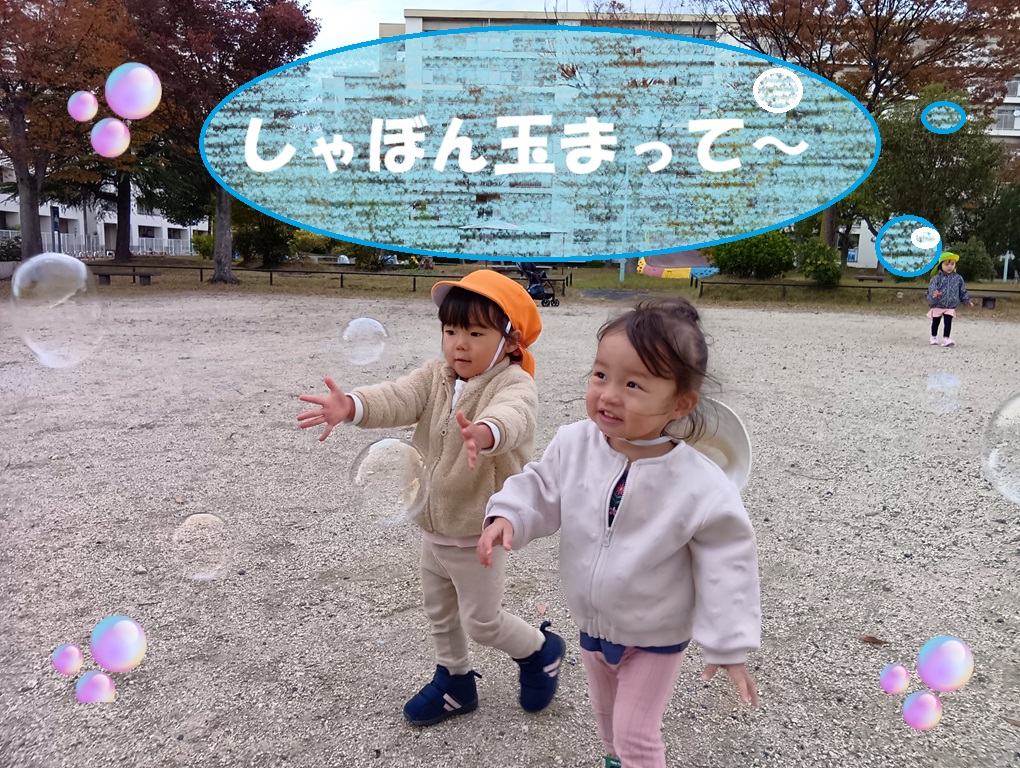 晴れた日には公園でシャボン玉を追いかけたり、かけっこをしたりと寒さに負けず体をたくさん動かして楽しんでいます!