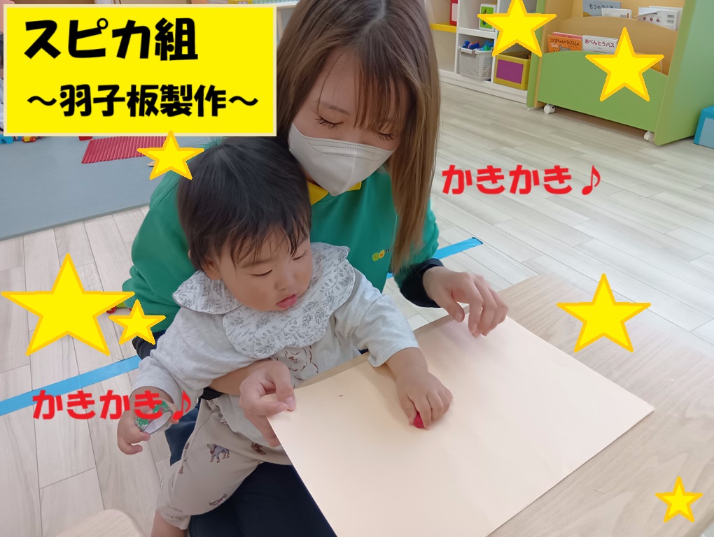 スピカ組(0歳児)は先生と一緒にクレヨンで大きな画用紙にお絵描きをして羽子板を作りました💖