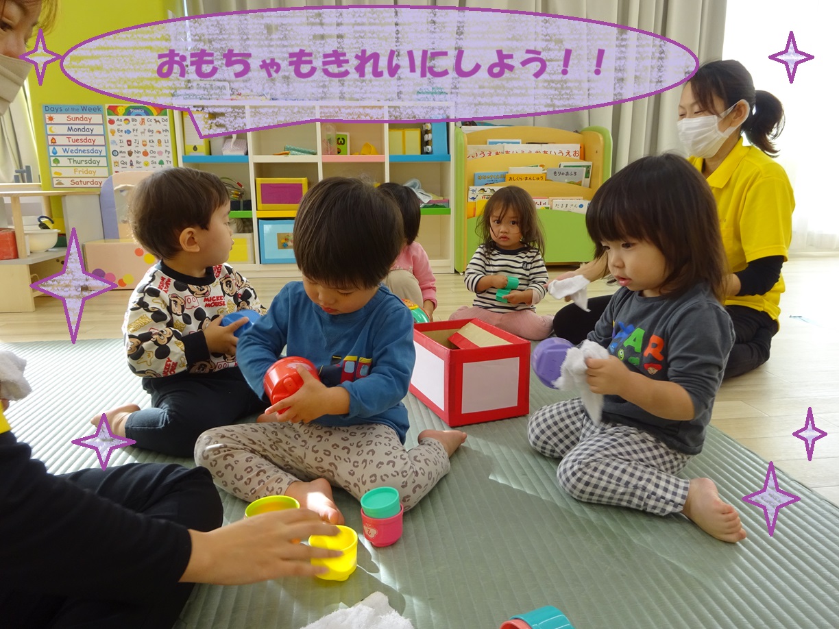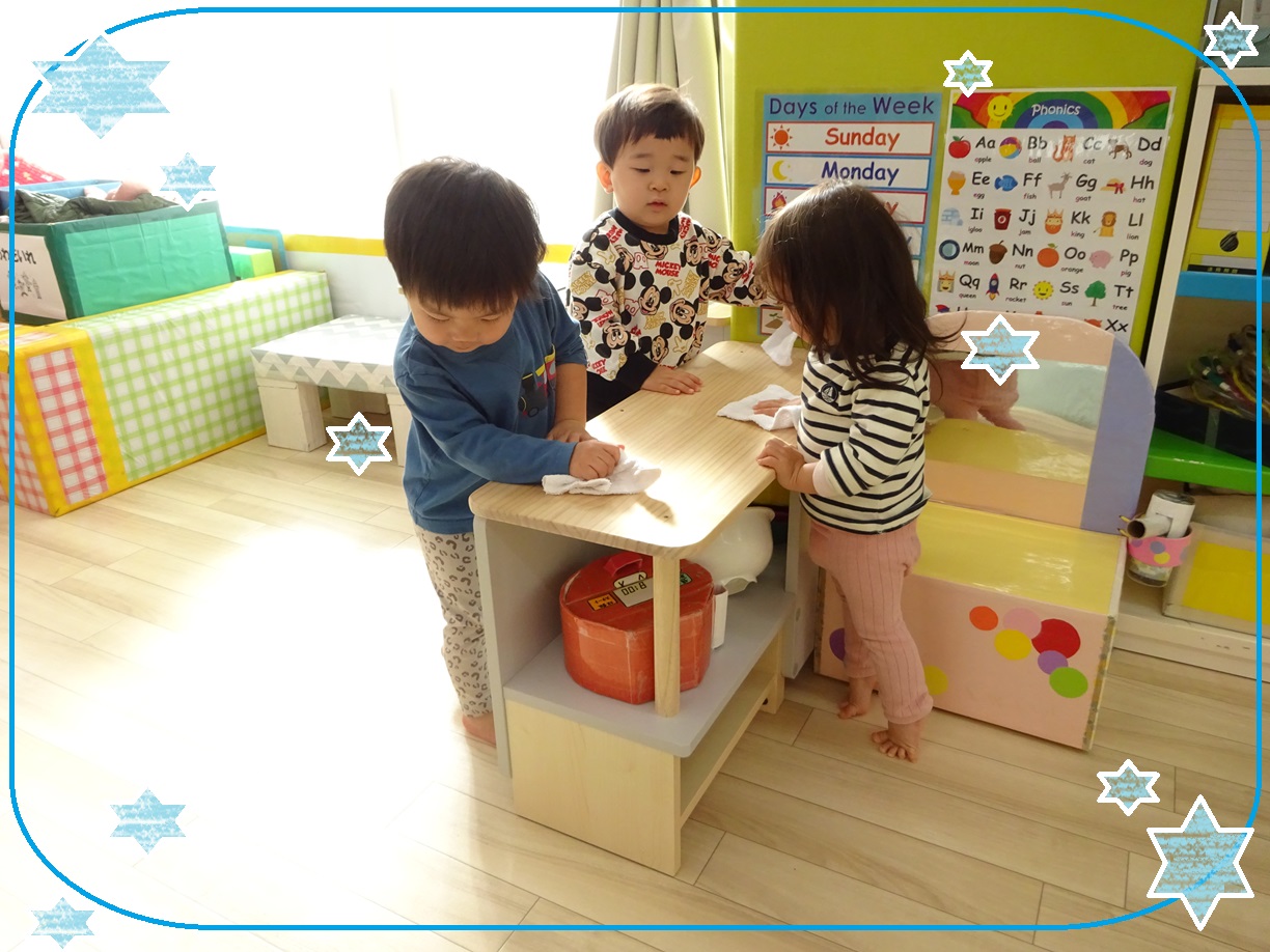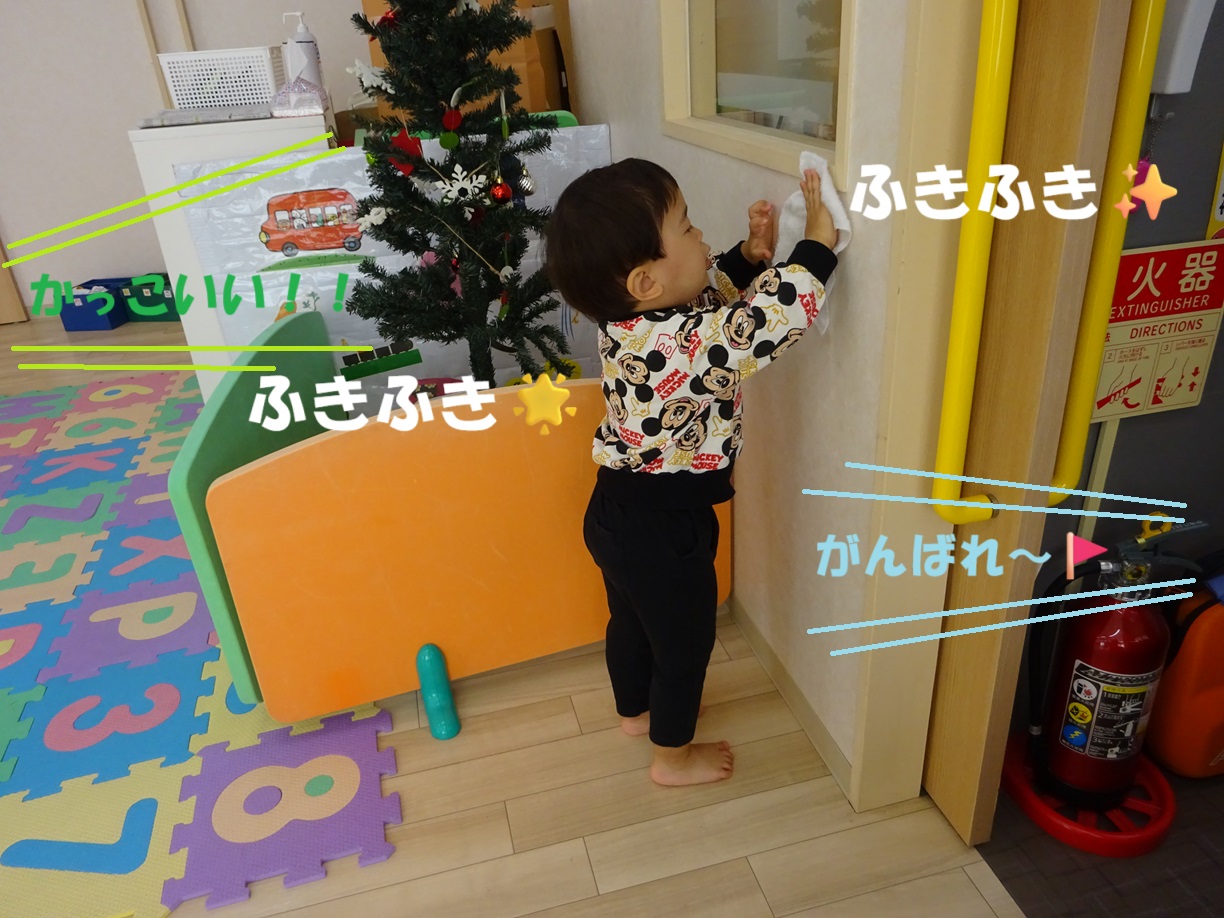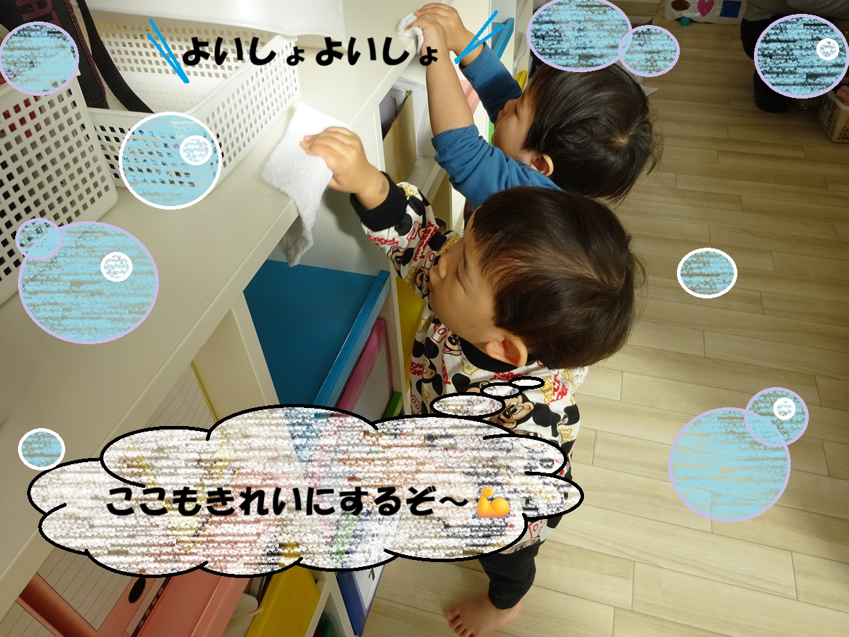 また自分のロッカーやいつも遊んでいる保育室内の床だけでなく、手洗い場や玩具まできれいに拭いてくれました🌟