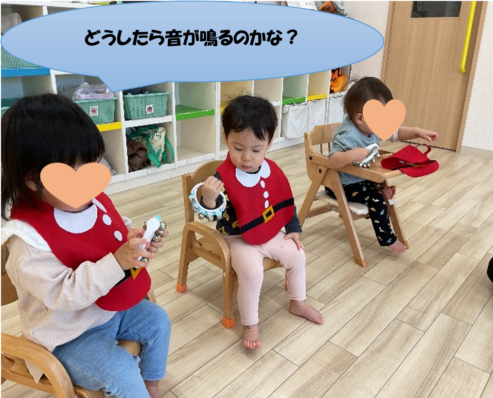 知っている曲が流れると保育士から鈴を受け取り、音楽に合わせて楽器を鳴らすことを楽しんでいます🌟