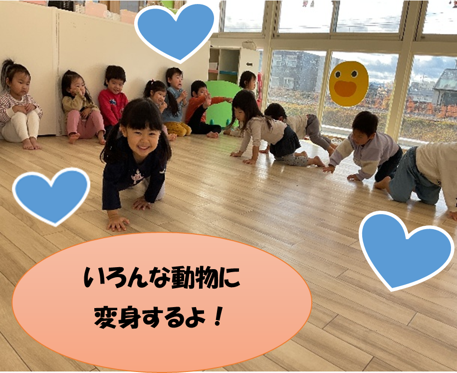 動物になって歩いたり、乗り物になって走ったり、どんぐりになってコロコロ転がったり音に合わせて全身を使い、思い思いに表現しています🌟
