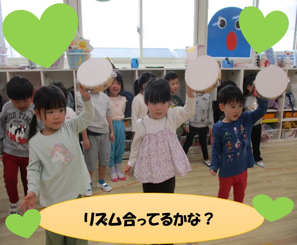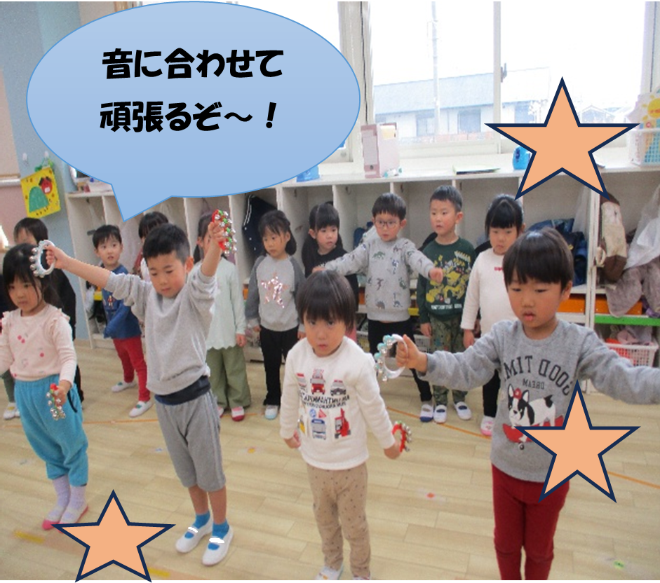デネブ組では、音楽参観に向けて鈴や手遊び、身体を使った歩き遊びを練習しています!