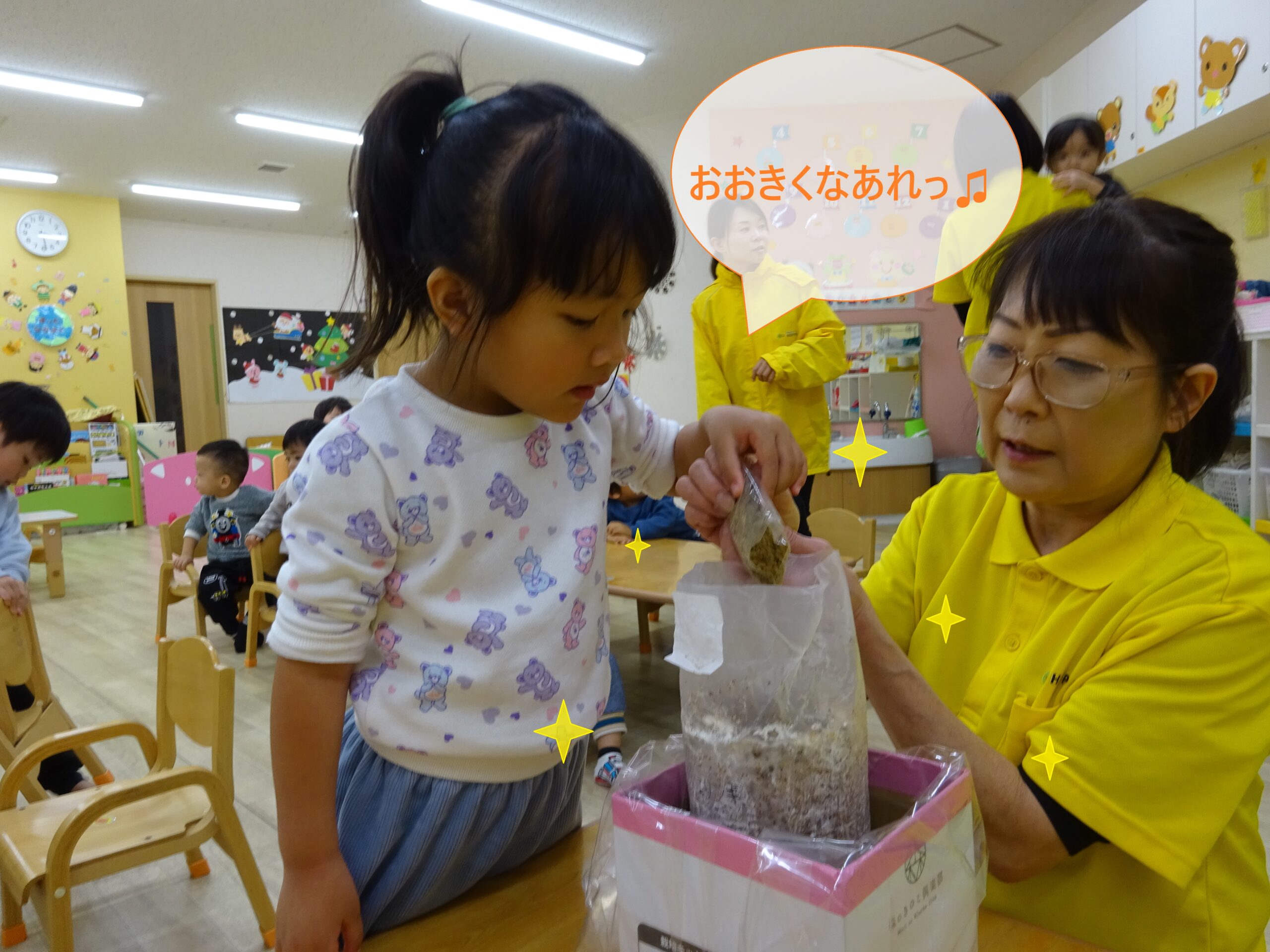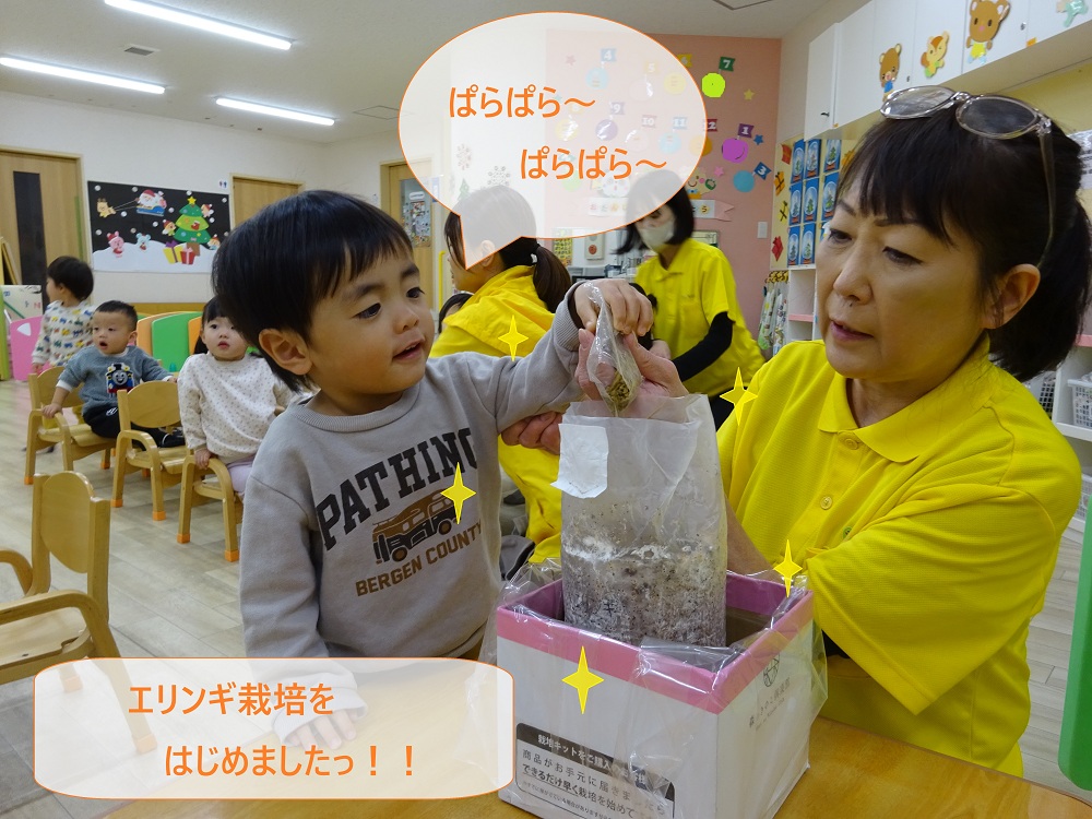 子どもたちが毎日霧吹きでお水をあげてくれており、無事に育てば年越し後の初登園日には収穫出来る予定です!🍄