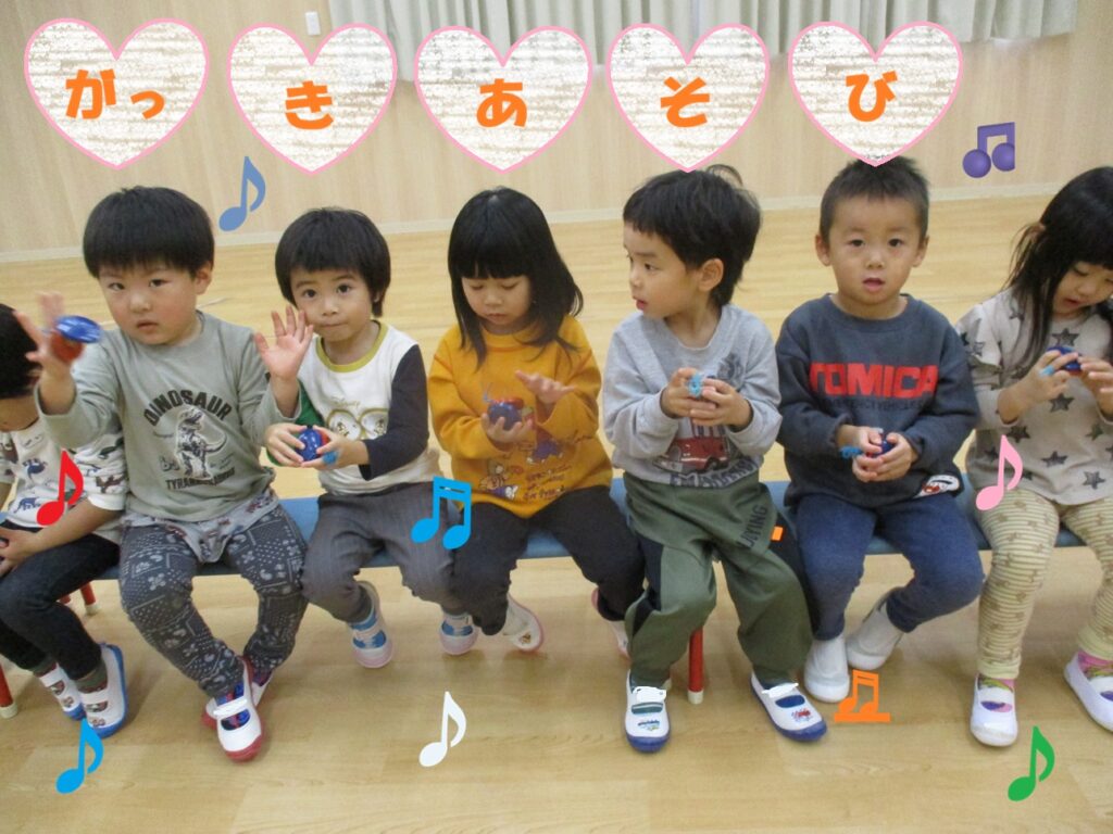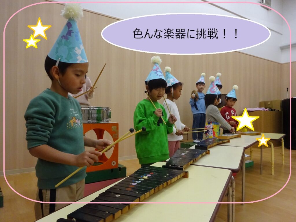 秋ごろから木琴や鉄琴、太鼓、ピアニカなど様々な楽器に触れ、楽器遊びを楽しみました♪