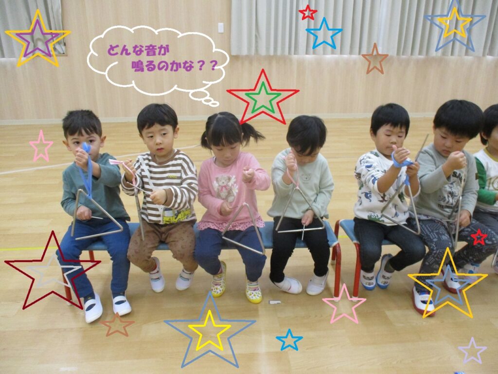 楽しみながら楽器に触れ、タンバリン・鈴・トライアングル・カスタネットの中から自分の好きな楽器を選び、「山の音楽家」の歌に合わせて合奏しました。