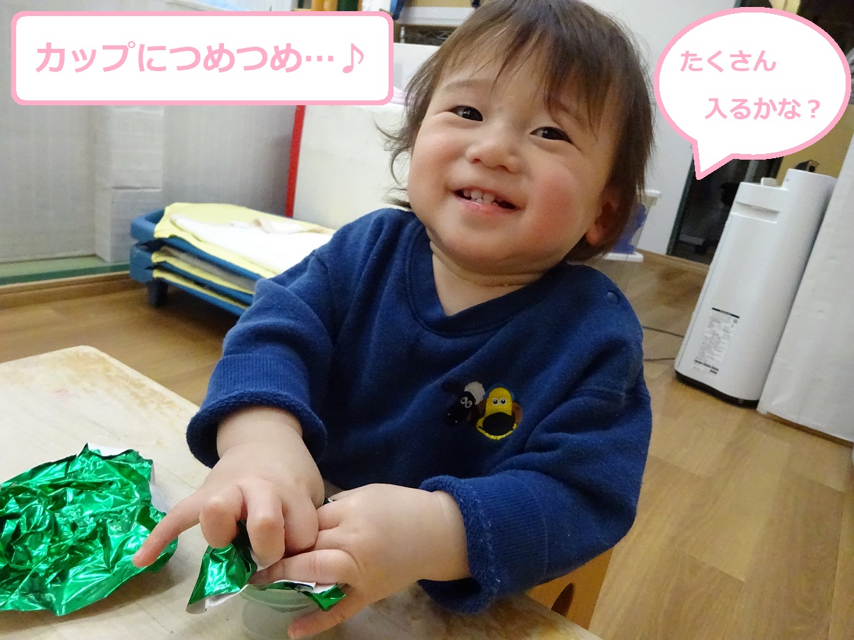 こちらもキラキラの折り紙を丸めてゼリーのカップに入れていました。