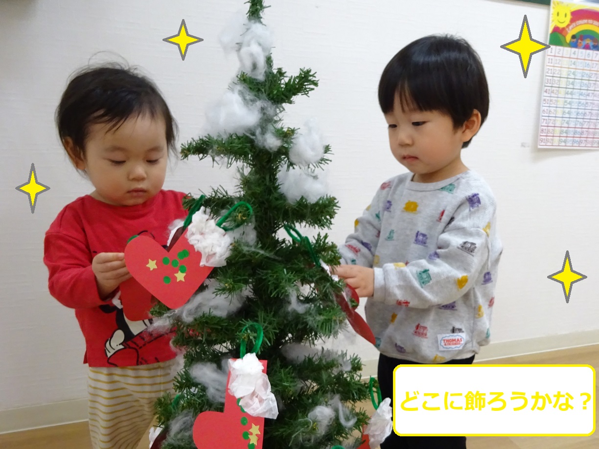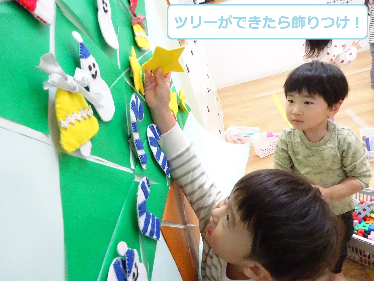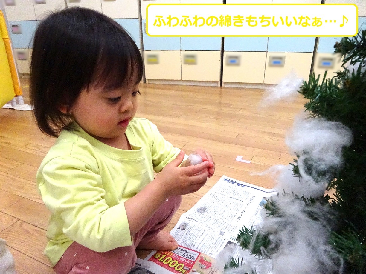 他にも、園の中に飾られているツリーに雪に見立てた綿をつけ、靴下のオーナメントも作っていましたよ👍