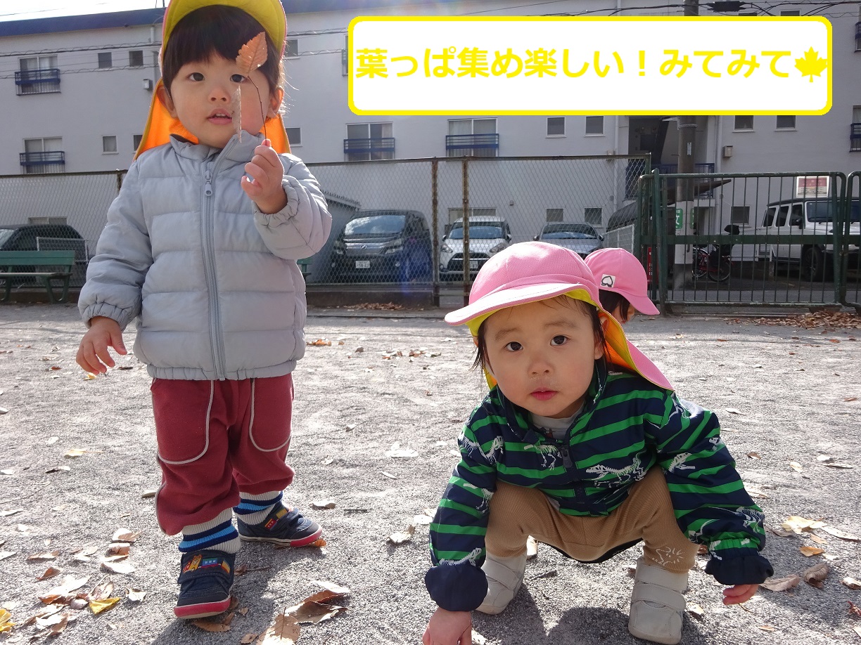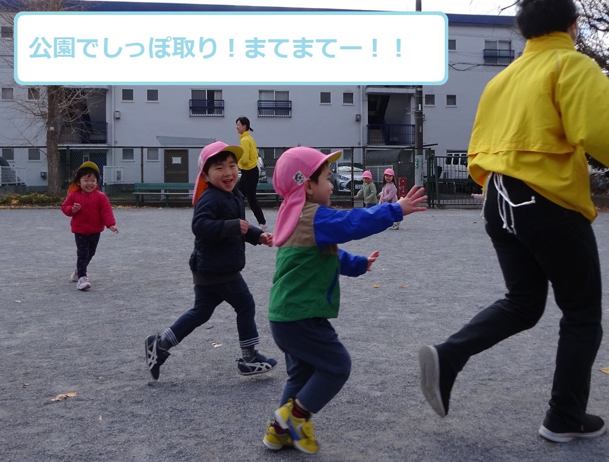 12月は寒さも厳しくなる時季ですが今年は比較的暖かい日が多く、戸外に出て追いかけっこや木の実拾いなどをして、身体を良く動かしてたくさん遊びました。