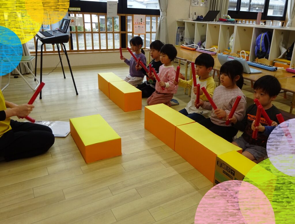 曲に合わせて太鼓をたたくことが最初は難しかったのですが、回数を重ねるごとに友だちの歌声や音をよく聞きながらリズムを合わせられるようになりました。