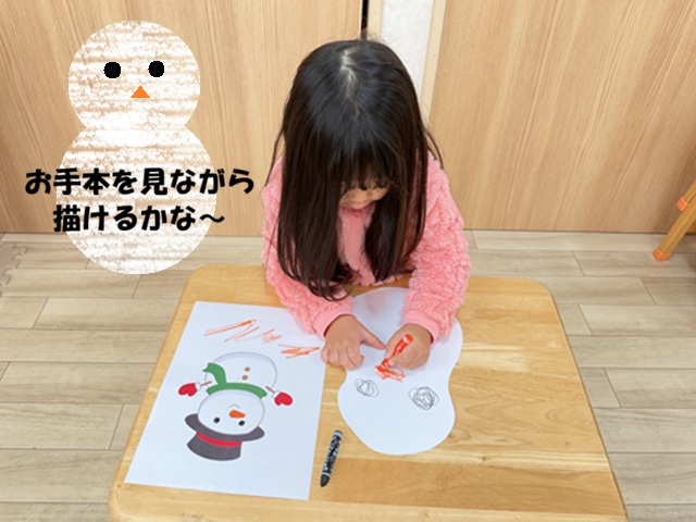 外の壁面に飾る雪だるまのお顔もお手本を見ながら、描くことができます⛄