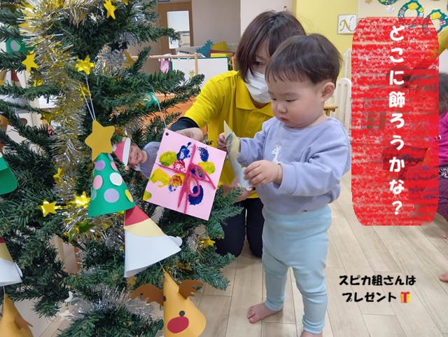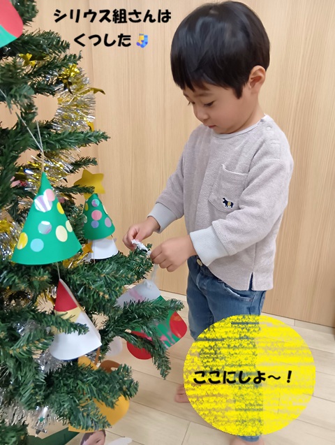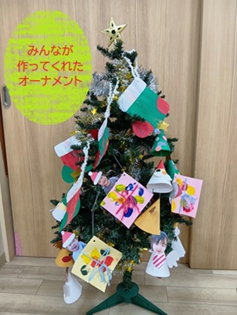 みんなが作ってくれたオーナメント(プレゼント、ツリー、サンタさん、トナカイ、天使、くつした)は朝の会やお帰りの会の時に、一人ひとりクリスマスツリーに飾りました🎄🌟