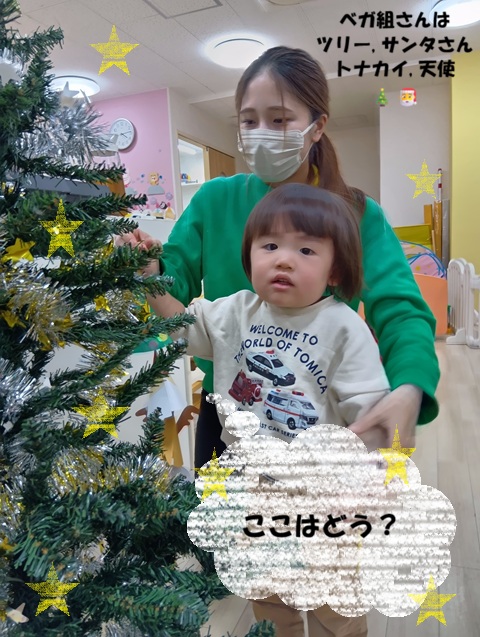 もみの木に「どんぐり、にんじん、リンゴ」の飾り付けを手伝ってくれるベガ組さん🥕🍎