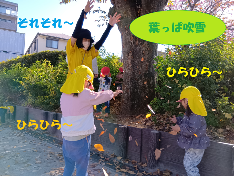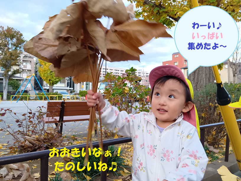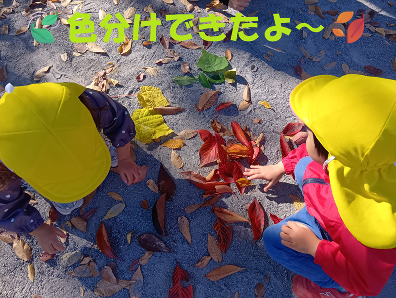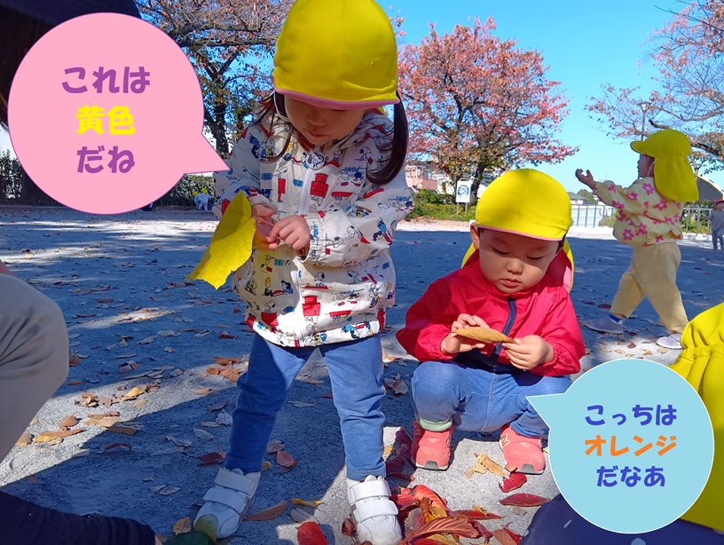「黄色いのがあったよ」「オレンジも!」とたくさんの葉っぱを集め始めました。