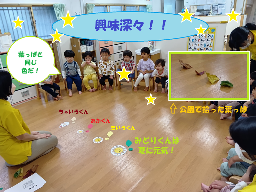 紅葉は葉緑体などの色素の変化で起こるのですが、さすがに難しいので色素を『みどりくん・きいろくん・あかくん・ちゃいろくん』と表現してお話をしました。
