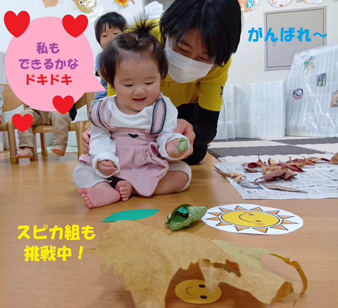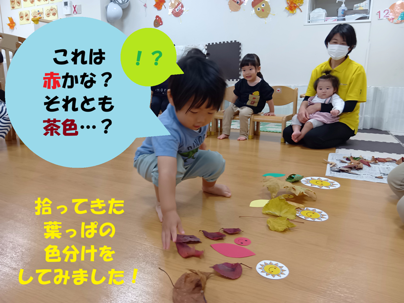 次第に色から感触や音にも興味が広がり、「黄色のはすべすべだけど、ちゃいろのはがさがさだよ」「ちゃいろいのを踏むとカサカサ鳴るね」と大発見を伝えに来てくれました。