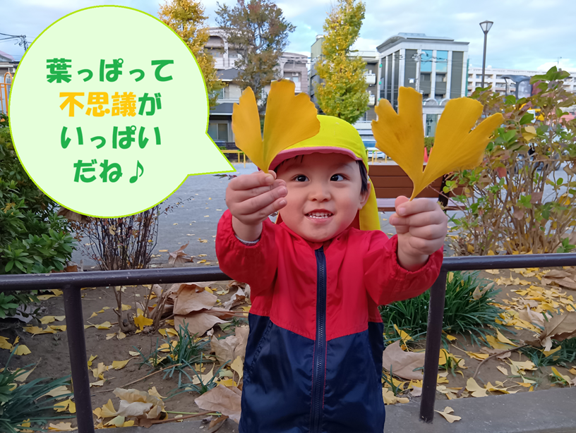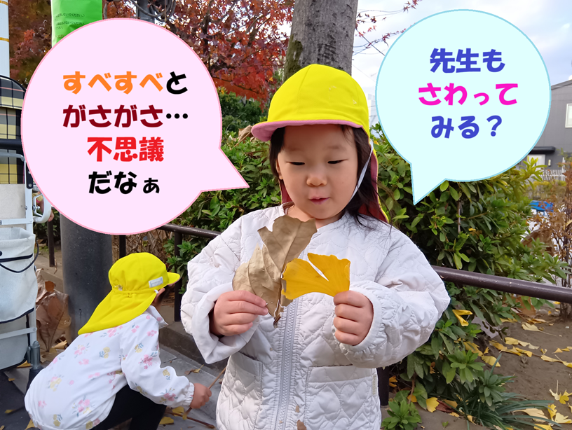 春、夏…と当たり前のように葉っぱに触れて遊んでいましたが、秋になって公園の木々の色の変化に気づいた子どもたち。