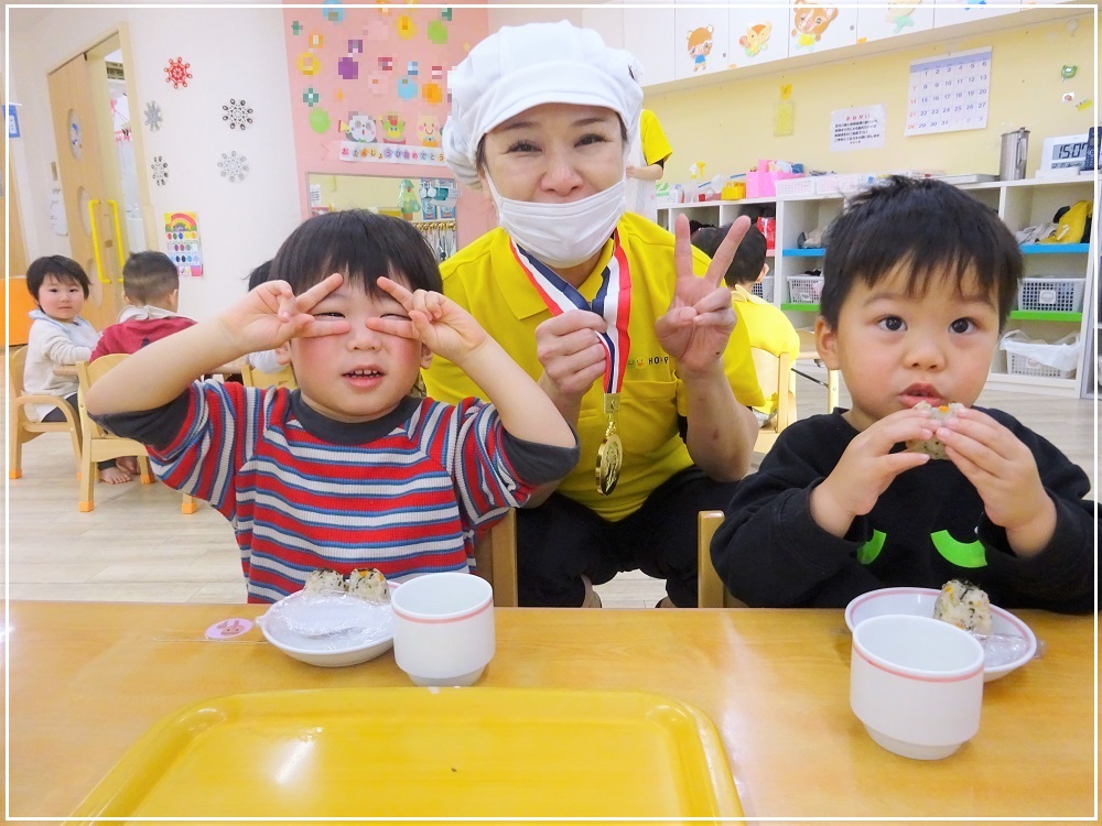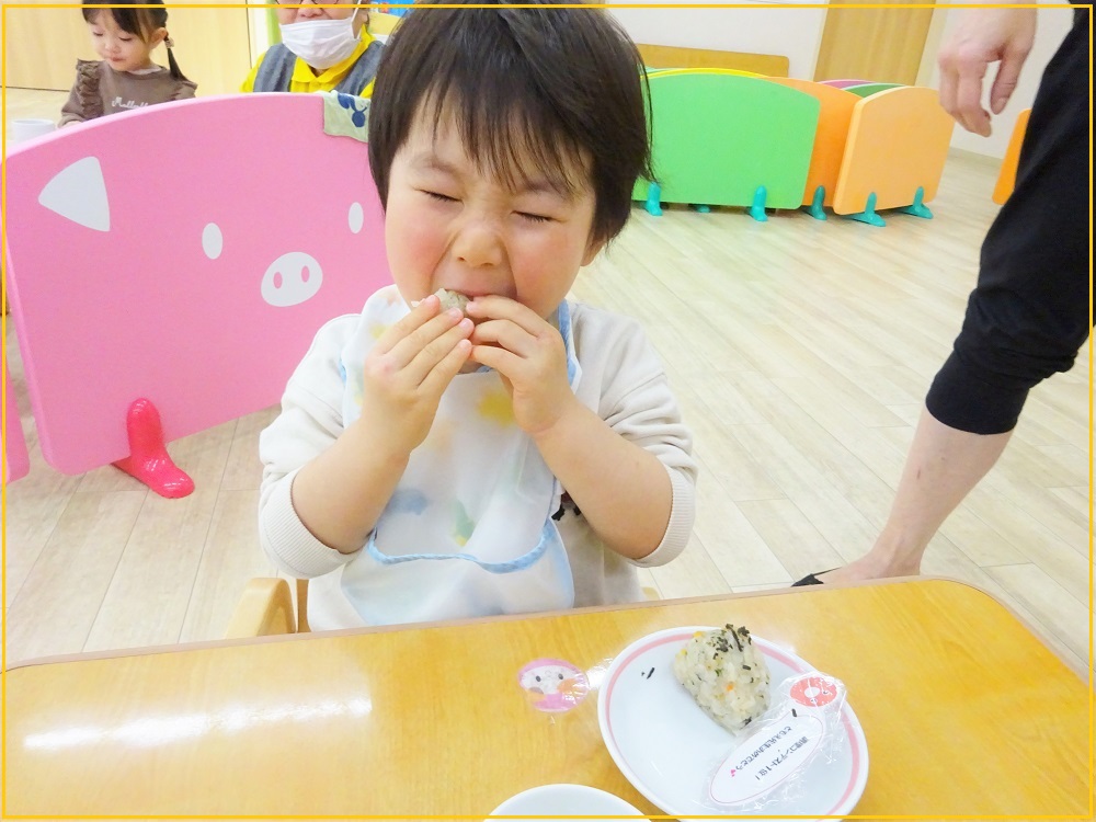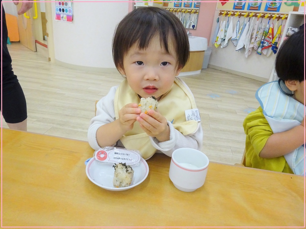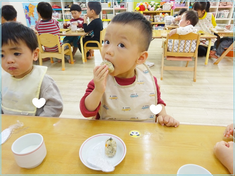 おやつの時間におにぎりが登場すると、「おいしそう!」「おにぎりだ~!」と興味津々✨