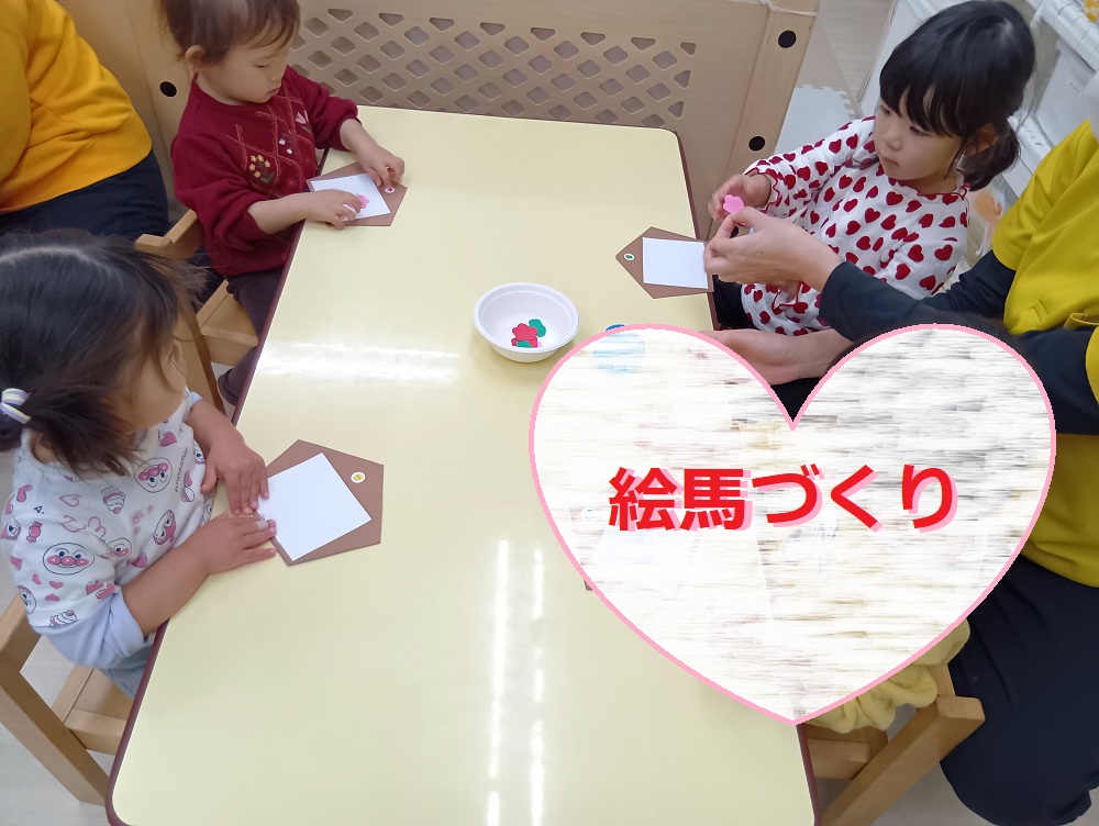 今月は毎年恒例となっている絵馬づくりと先日の食育の様子をお伝えしたいと思います。