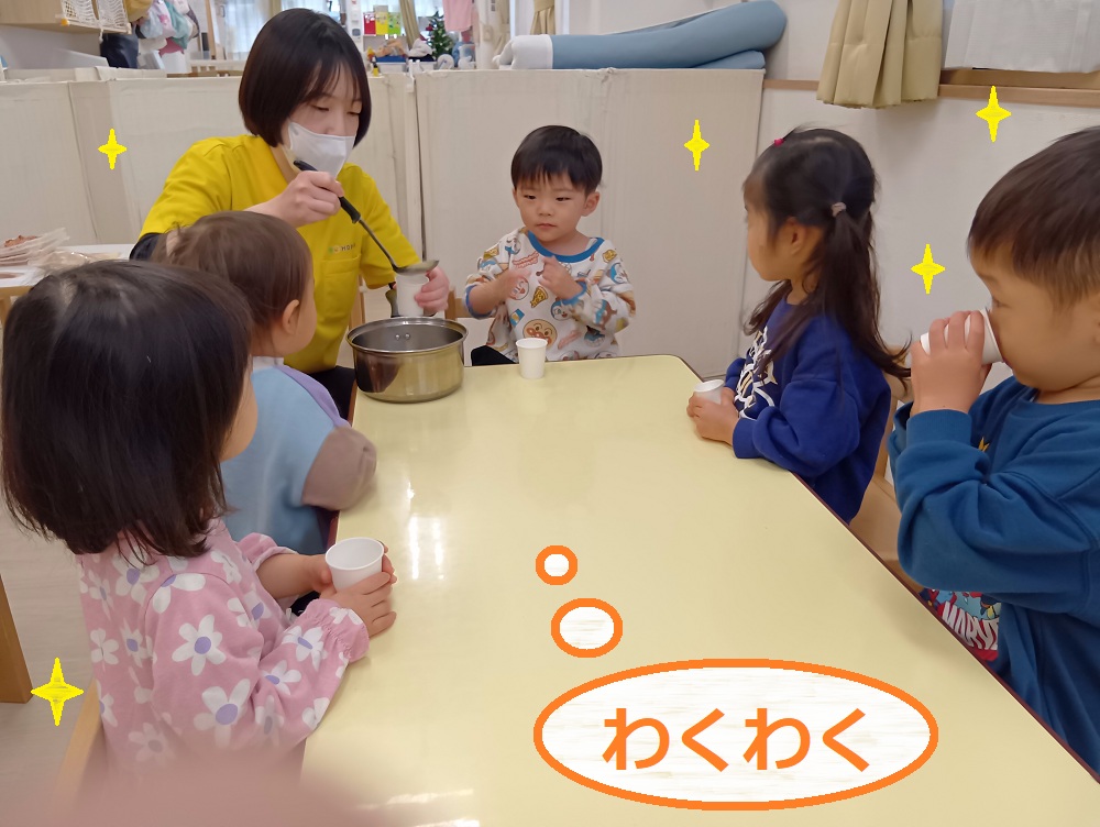 できた出汁をみんなでいただくことになりました。(この出汁は調理さんが事前に作っておいたものです。)味はどうかな?