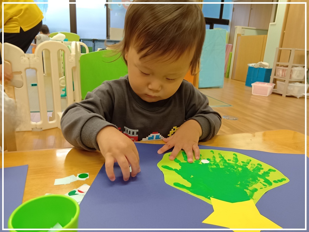 絵の具やシール、のりなどを使い、子どもたちはそれぞれのペースで製作に取り組んでいます。