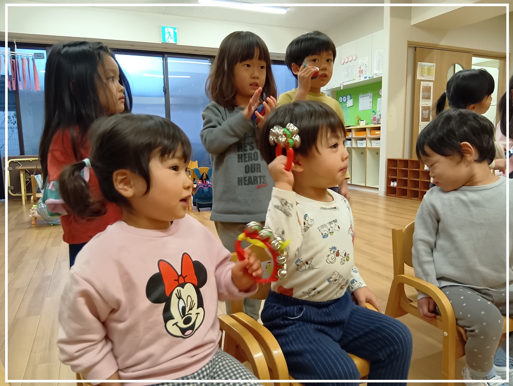 1歳児のスピカ組、2歳児のリゲル組は、すずを持って、歌に合わせて演奏します🔔