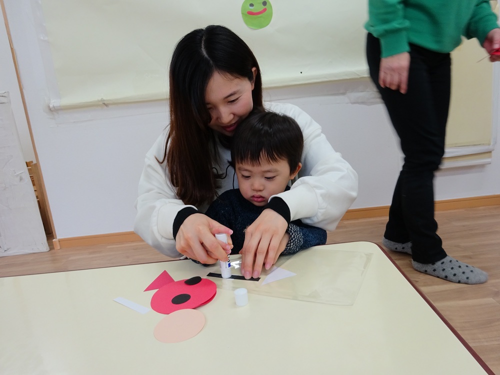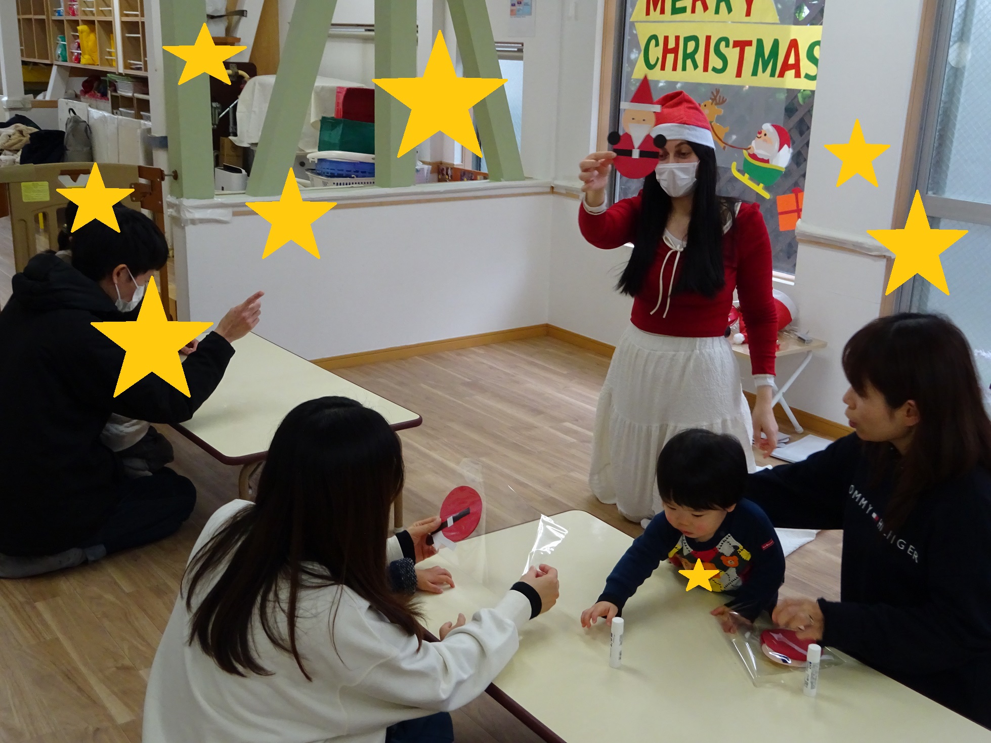 今回は、「クリスマス製作・English体験」をテーマにEnglish teacherのメリエム先生、5組のご家族と楽しい時間を過ごしました。
