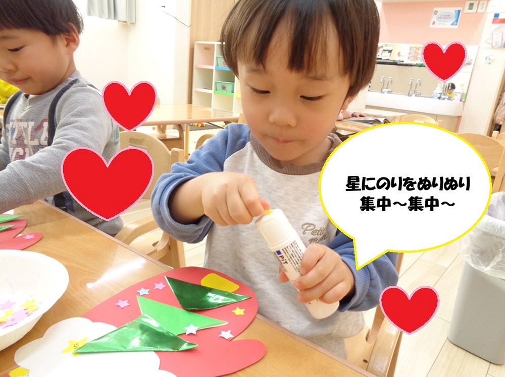 キラキラ輝く折り紙をハサミで切り、自分でのりを使って飾りつけをしましたよ!