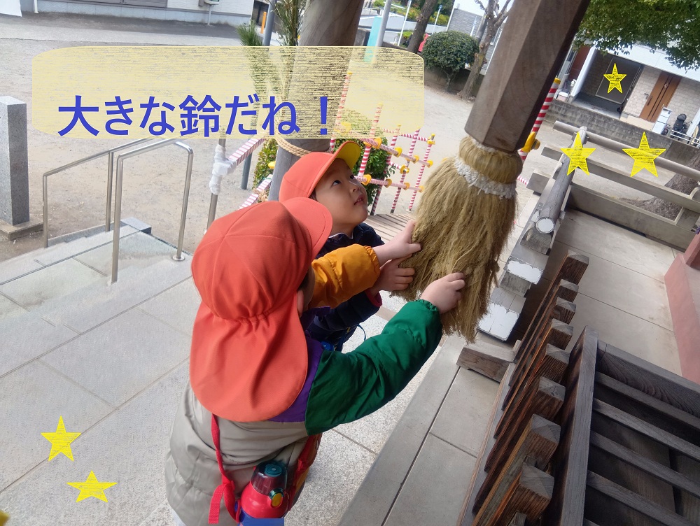 大きな鈴を鳴らし「神様に聞こえるかな?」「おうちでも初詣にいったよ」とお話しをしながら、お参りしました。