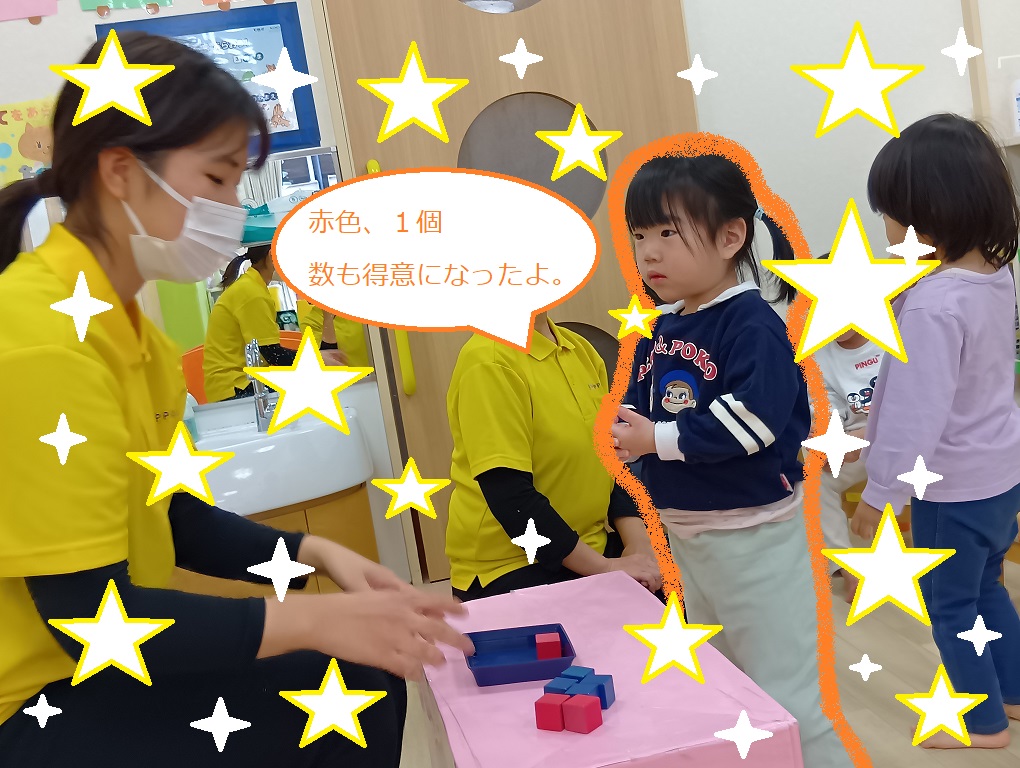 「〇個ください」と先生が伝えた数を見本の数シートの上に並べて「できました!」とやり取りもできるようになりました。