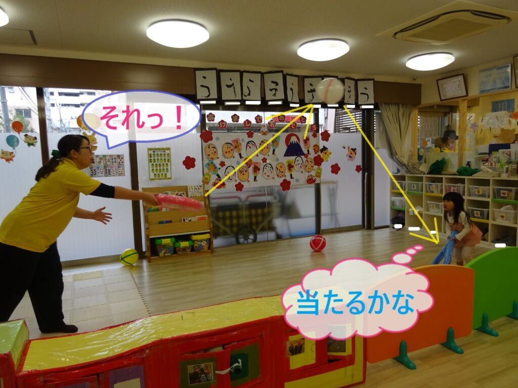 ボールを乗せて上にぽーんと打ち上げるなど、それぞれが出来る方法で楽しみました。