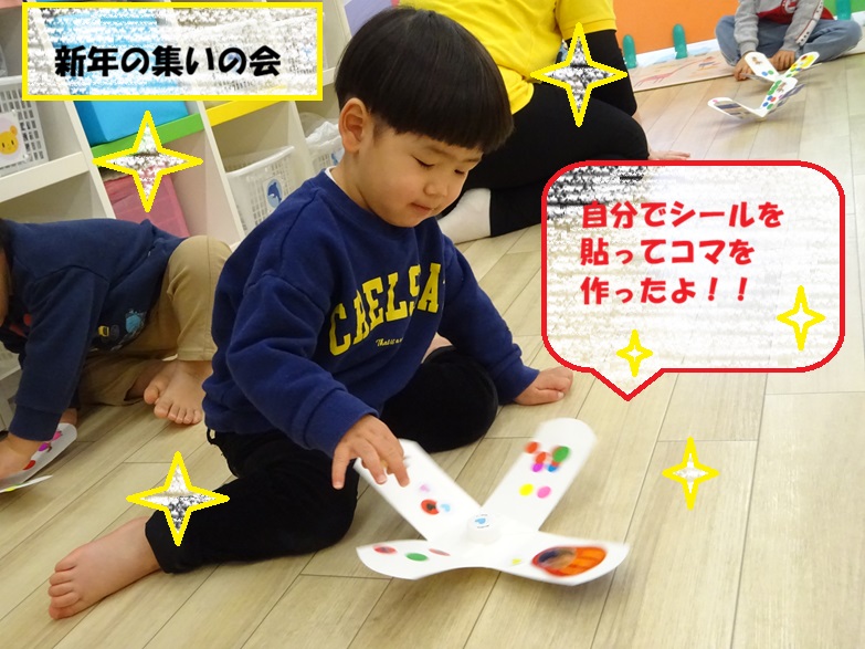 新年最初の行事「新年の集い」では、自分たちでシールを貼ってコマ作りを楽しみました。