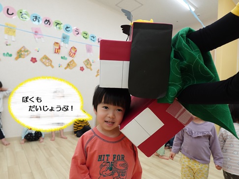 獅子舞に頭を噛んでもらうと、1年間元気にすごせるよという話を聞いてトップバッターでがんばってくれたのはシリウス組(2歳児)さん。