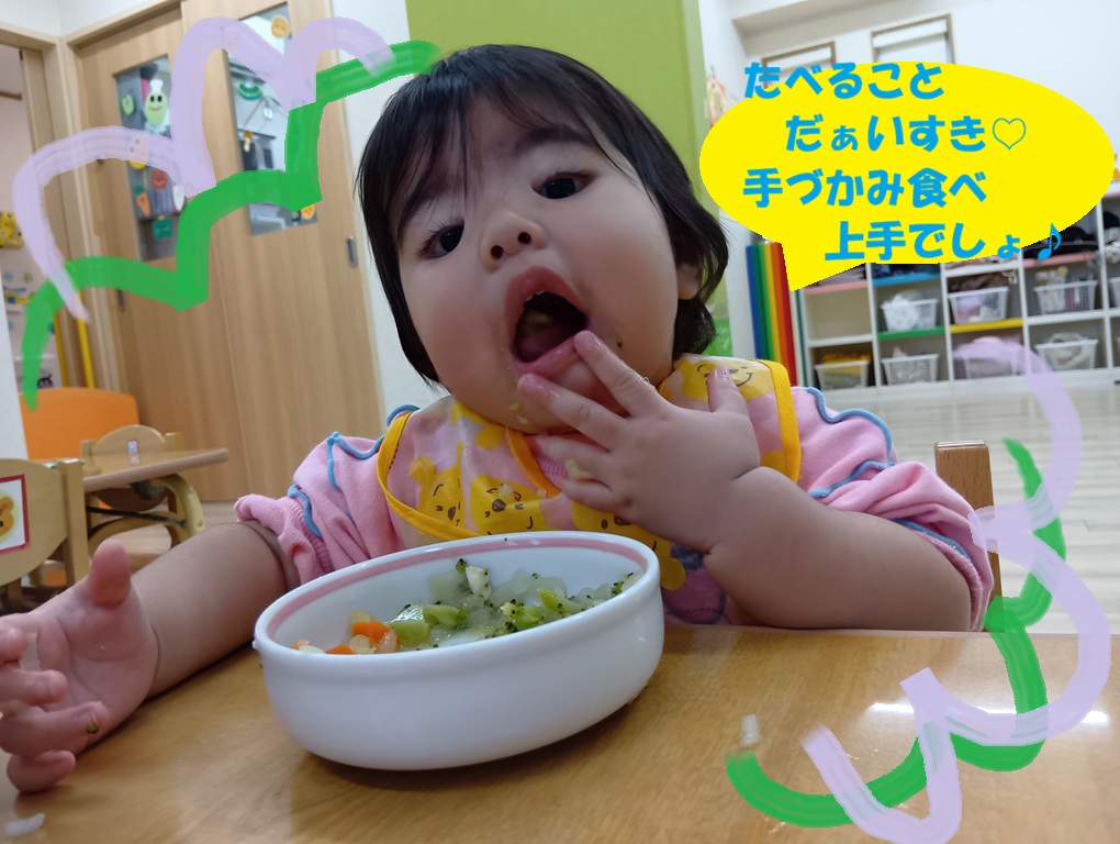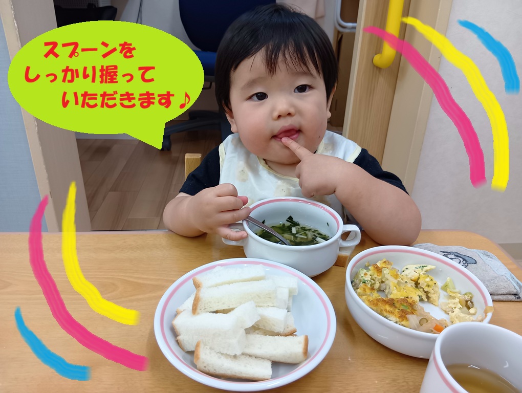 手づかみ食べで豪快に食べたり、スプーンを握ってみたり嬉しそうです😊