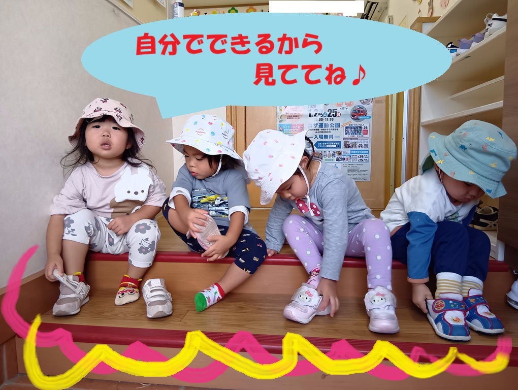 時々「靴下を履きたいから手伝って~」ということもあるので、その時は手伝ったり少しだけ手を添えたりと、「できた!できるようになりたい!!」という気持ちを大切にしながら援助しています😊✨