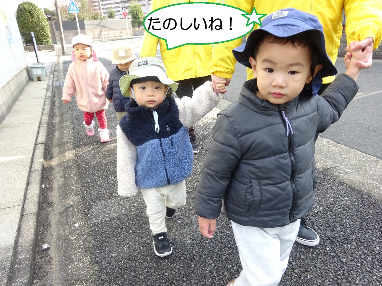 お散歩では、保育士と一緒に外側を歩く練習をし、安全に意識を向けながら楽しく取り組んでいます🌈