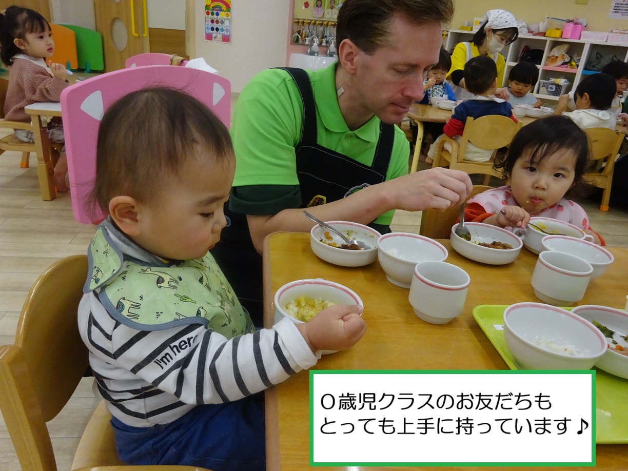 食事の時間には、食具を持って食べてみようとする姿が見られるようになりました。