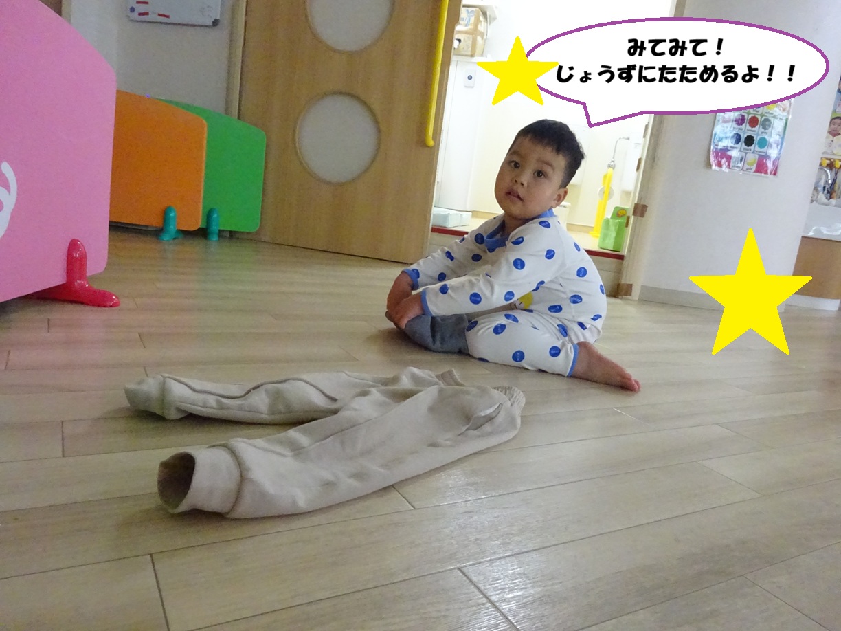 衣服の着脱では、服を着たり脱いだりするだけでなく、畳んで片付けることにも挑戦中です!