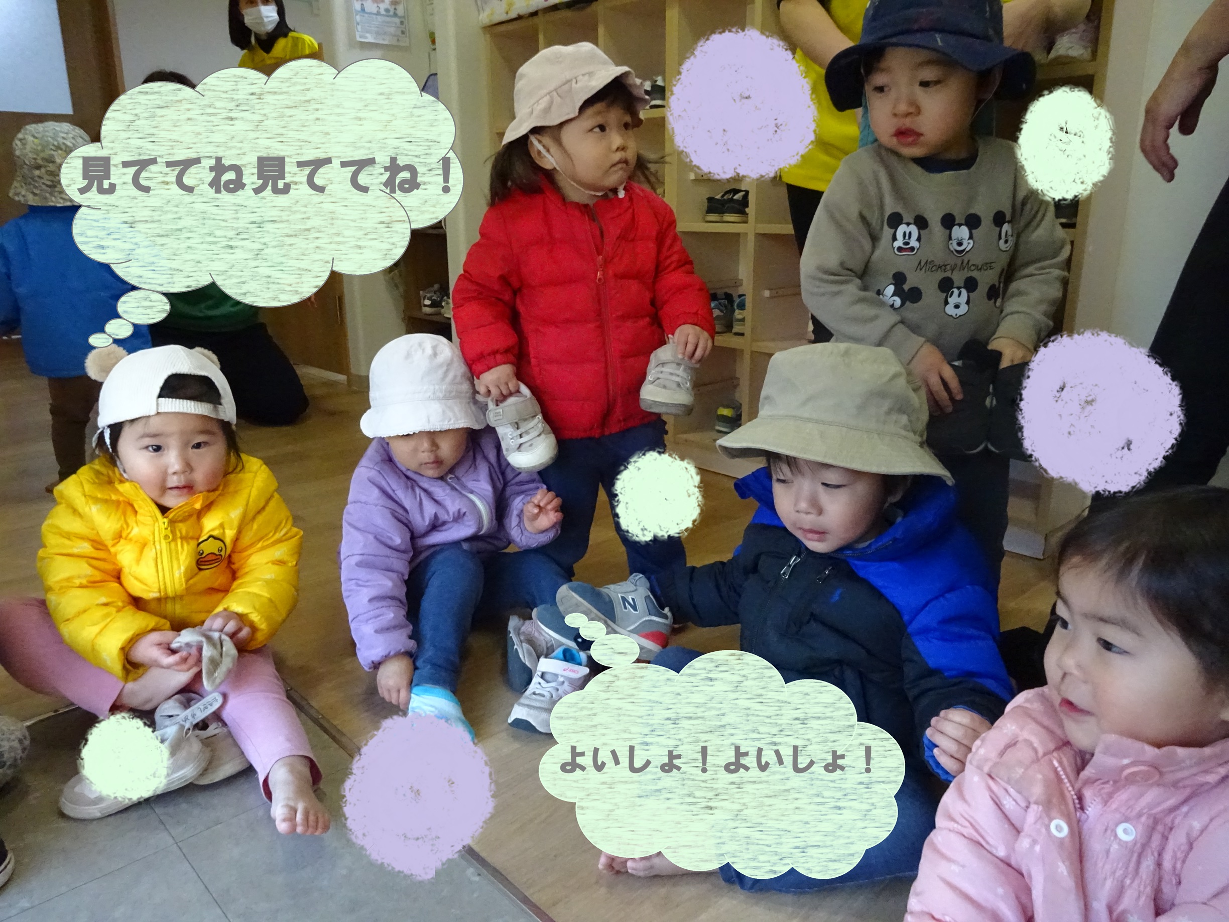 スピカクラス(1歳児)では、進級に向けて身の周りの事を自分自身で行えるように着替えや靴、靴下の脱ぎ履きに挑戦中です。