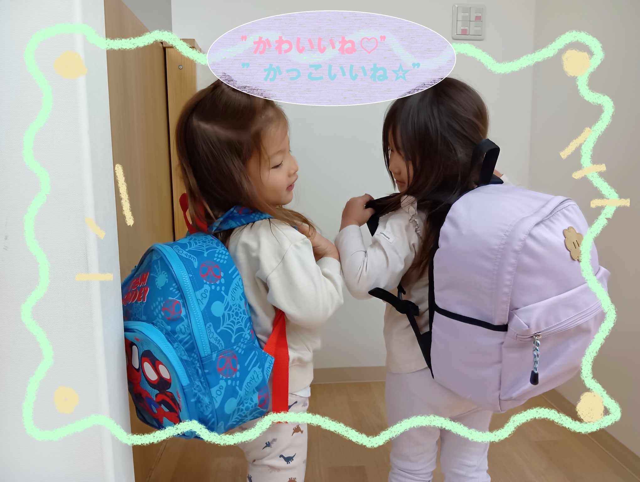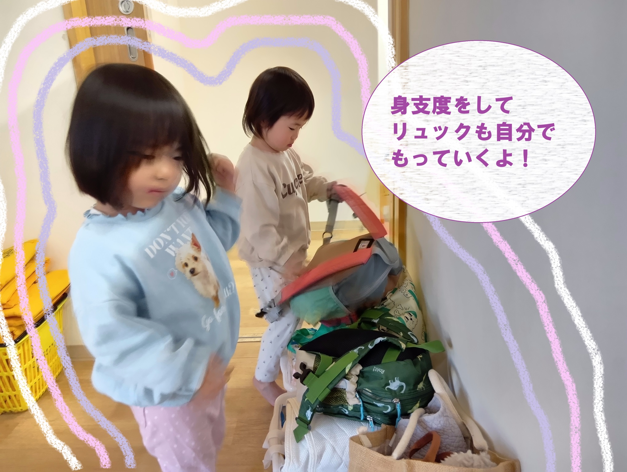 お帰りの前に、お着替え、歯ブラシセットをリュックサックに確認しながら入れ、お友だちとお話ししながらリュックサックを背負い廊下まで持っていくことを行っています。