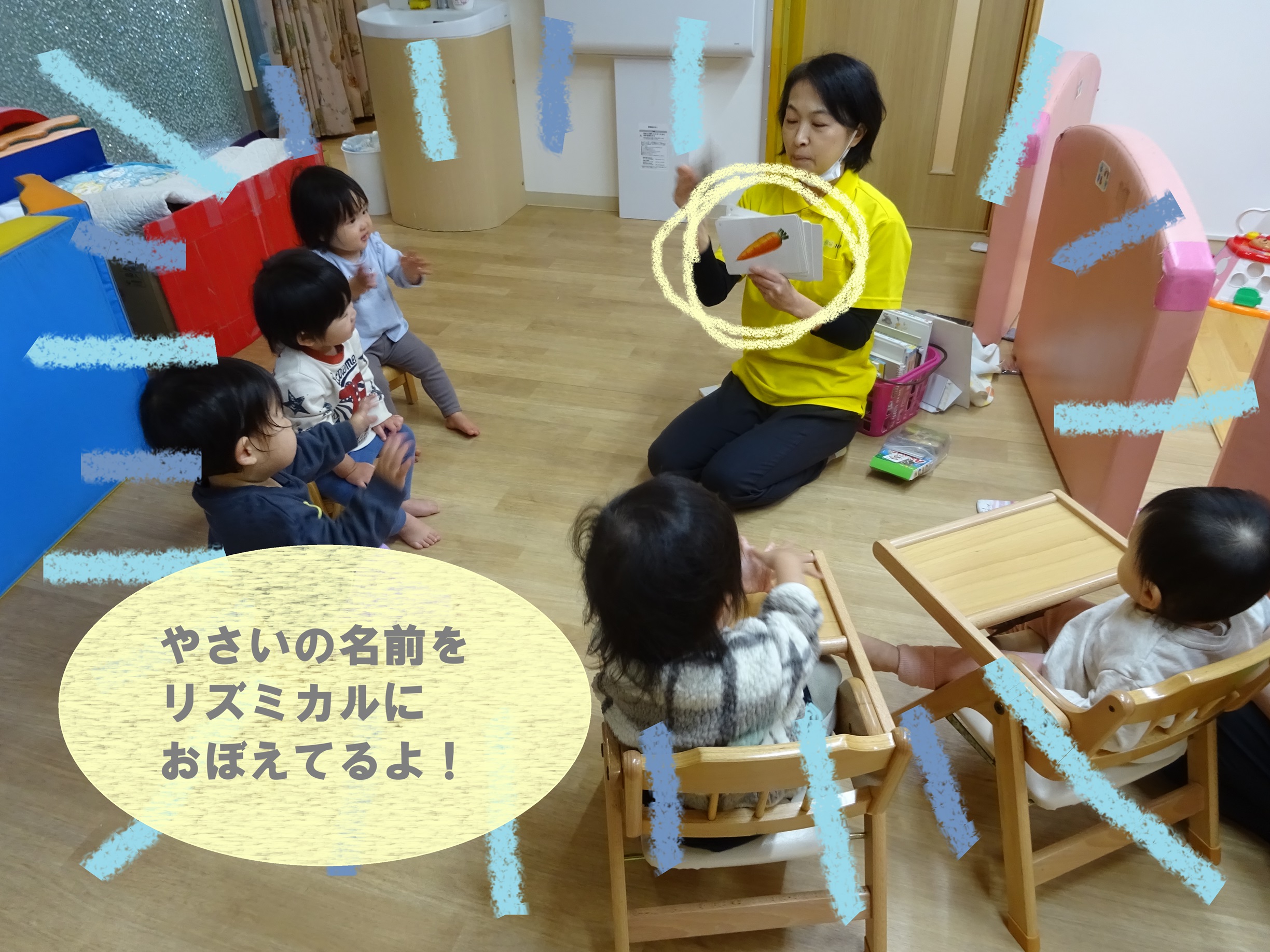 4月から毎日欠かさず知育を行ってきた成果が出て、カードの写真を見て言葉を伝えようとしたり、絵本の動物の真似をしてみたりと色々なことが出来るようになってきている子どもたちです。