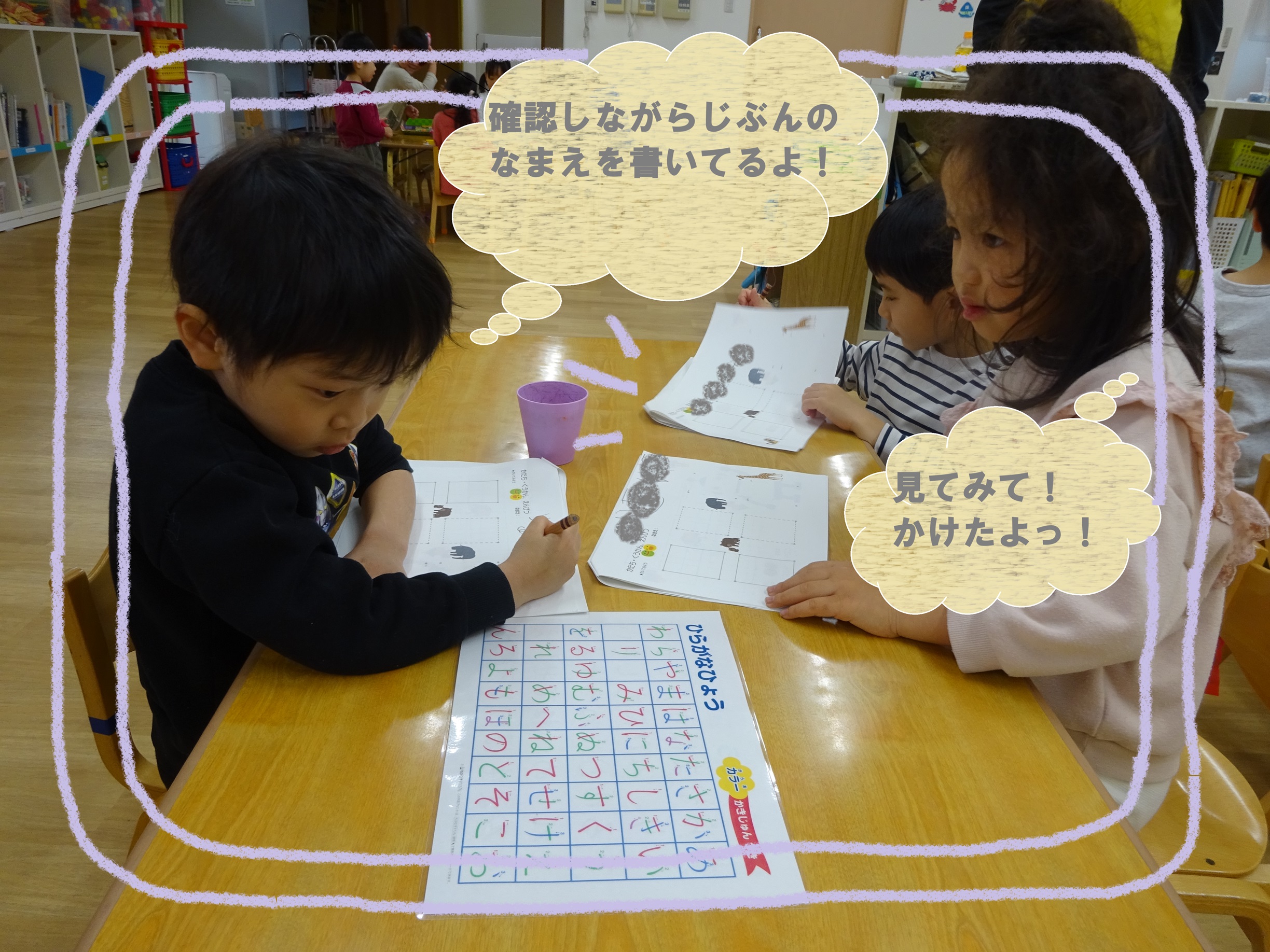 少し前までは、自分の名前を見ながら書くことが多かったのですが、今はあいうえお表を見て自分で字を探し書く事を頑張っています。