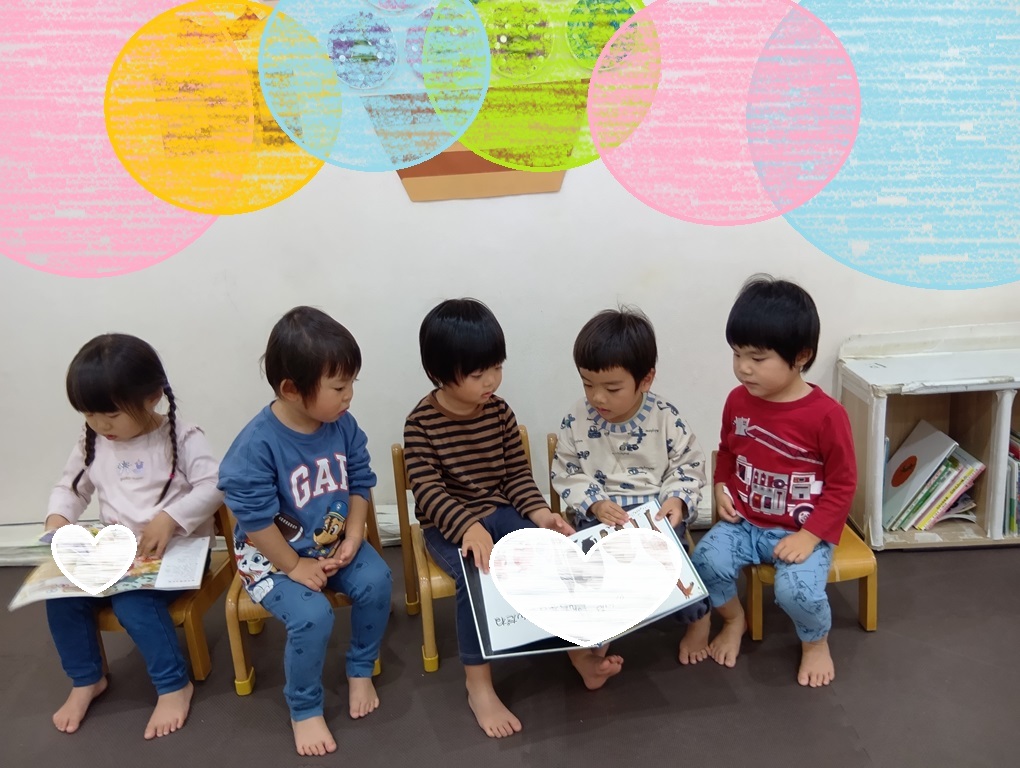 能力開発レッスン(知育time)の前のちょっとした時間には、いすに座って自分で絵本を見ています。