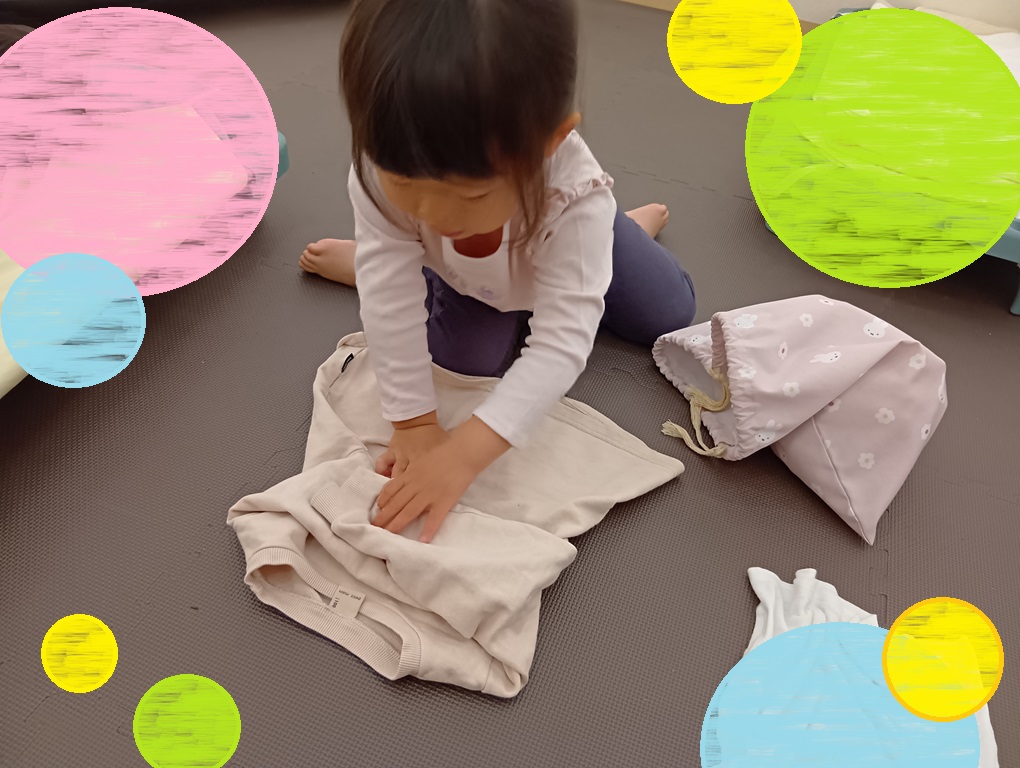 着脱した衣服も「はんぶんこ、はんぶんこ」と言いながらたためるようになってきました。
