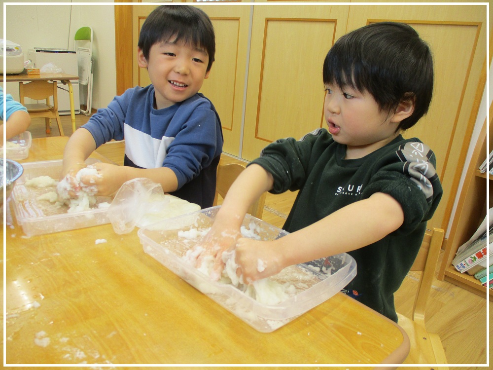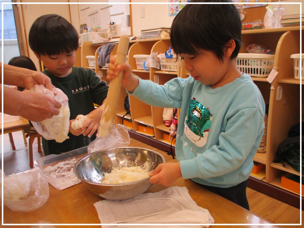 ベガクラス(4歳児)さんは、お餅つきを行い、もち米のご飯からお餅になるまでを体験しました。