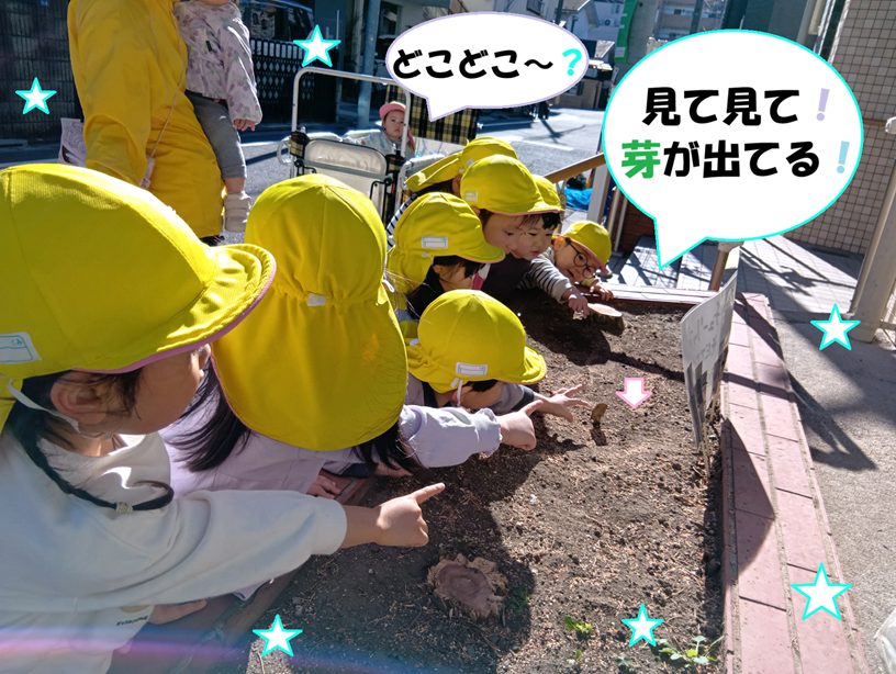 先日植えたチューリップが芽を出し大喜びの子どもたちです!