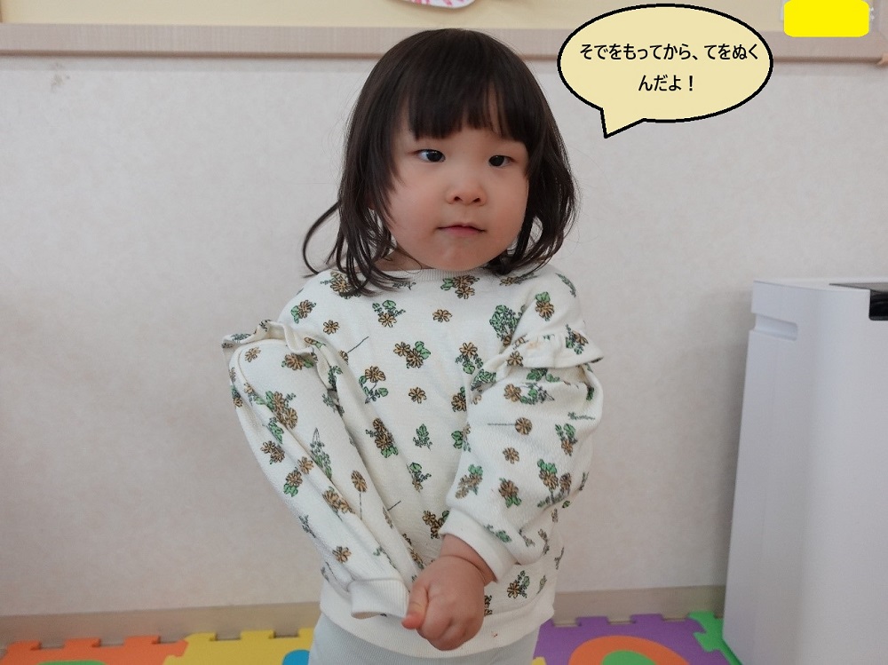 最初は難しく、苦戦することもありましたが、袖をしっかり掴んで脱ぐというコツを見つけると、上手に腕を抜いて着脱をすることができるようになりました!