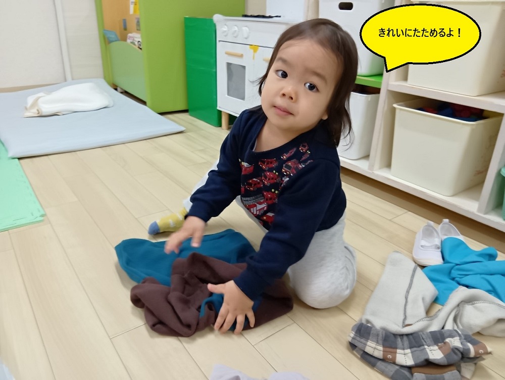 裏返しの服を自分で戻したり、端と端を合わせて綺麗に畳みます。